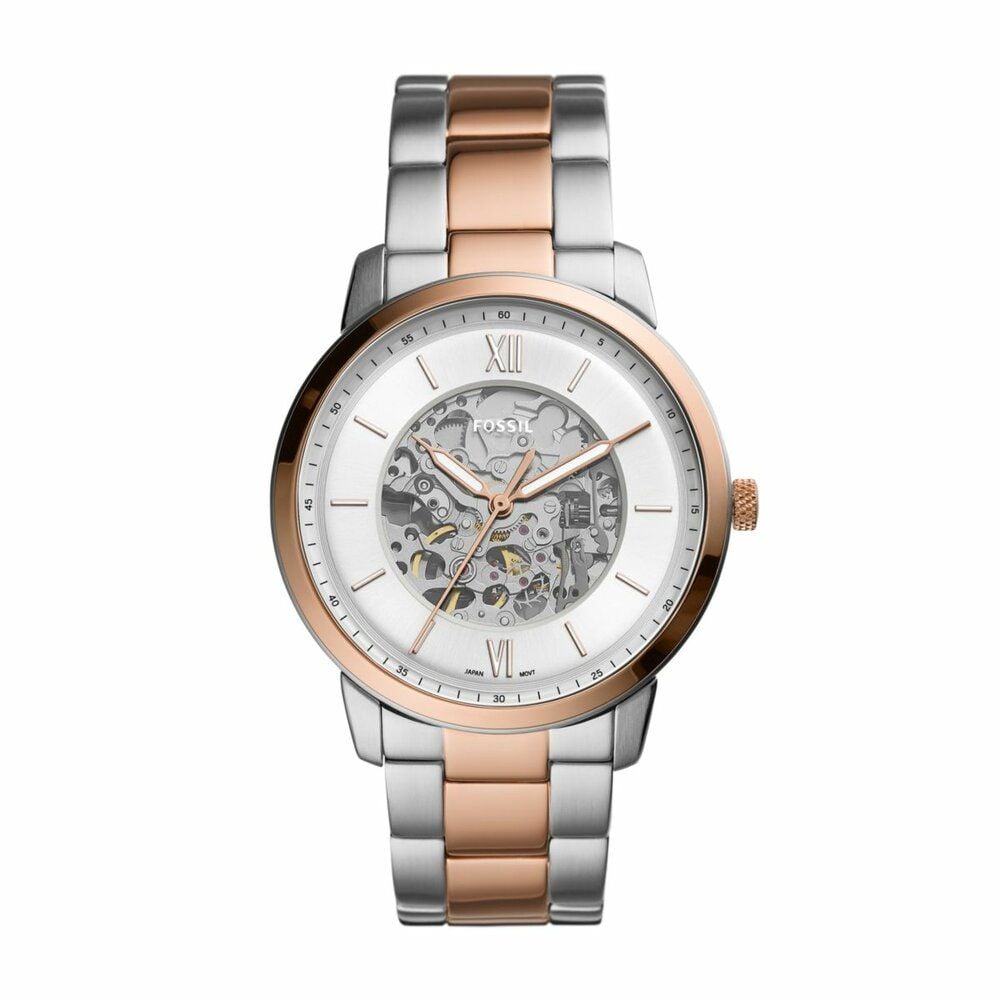 This 44mm Neutra Automatic features a white sunray dial, automatic movement and a two-tone silver and rose gold stainless steel bracelet.